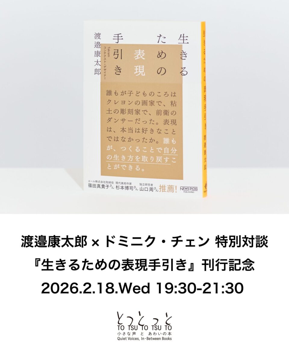 この場所の共同創業者であり、コンテクスト・デザイナーの渡邉康太郎さんによる新刊『生きるための表現手引き』の刊行を記念し、特別な対談イベントを開催します。