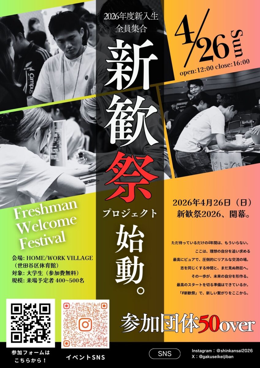 「サークル選びに失敗したくない」「安心して話せる友達や先輩が欲しい」そんな想いに応える、国内最大級の新歓イベント「新歓祭2026」を開催します 。 東大・早慶・MARCHなど、関東の有名大学から40以上の学生団体・インカレ・サークルが大集結